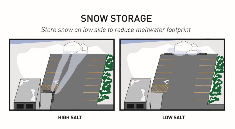 to design for rainfall and, therefore, is often overlooked, but some experts in the field are starting to awaken to opportunities for improving winter design. When snow storage is properly sized and located, and the meltwater footprint is controlled, safety is increased. Also, the need for salt is reduced. Less salt protects soil, vegetation and water, which is a core goal in erosion and sediment control.