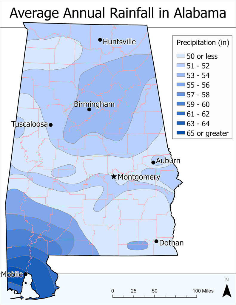 The City of Auburn receives about 52 inches (132 cm) of precipitation annually. While this is a relatively high amount of rainfall compared to other places in the United States, some areas of the Mobile River Delta see over 65 inches (165 cm) of average annual precipitation, with the City of Mobile being the rainiest in the U.S. (Fig. 2). Along with an active water cycle, Alabama has the highest freshwater biodiversity in the US.1