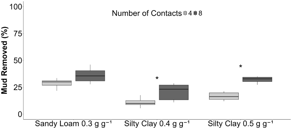 When testing was conducted with a subset of soils and the contact number was doubled from four to eight, only the stone method had a proportional increase (2X) in mud removal. The stone exit removed more than double the amount of silty clay at 0.4 g g-1 when the contact number was increased from four to eight, 3.6% and 8.1%, respectively, but in both cases, mud removal was relatively low (Figure 4). While FODS Trackout Control Mat had significant increases in mud removal with increased contact numbers for both water contents of silty clay and RubberForm Trackout Control Mat had significant increases in mud removal with increased contact numbers for sandy loam at 0.3 g g-1, neither of these devices had proportional increases in mud removal (Figures 5 and 6). This suggests a diminishing return on mud removal with extended lengths of track-out prevention methods.
