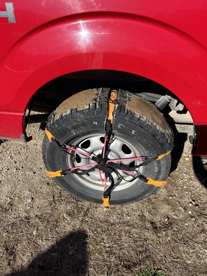 Tires were cut into 14-inch (35.6-cm) sections, and pre-portioned mud was evenly distributed to a 12-inch (30.5-cm) long portion of each tire section. The mud was uniformly pressed into and over the tread of the tires using a metal spatula. These tire sections were then attached to a vehicle tire and driven over a given prevention method to produce four or eight contacts (Figure 2). Mud removal was determined by weighing the tire sections before and after testing.