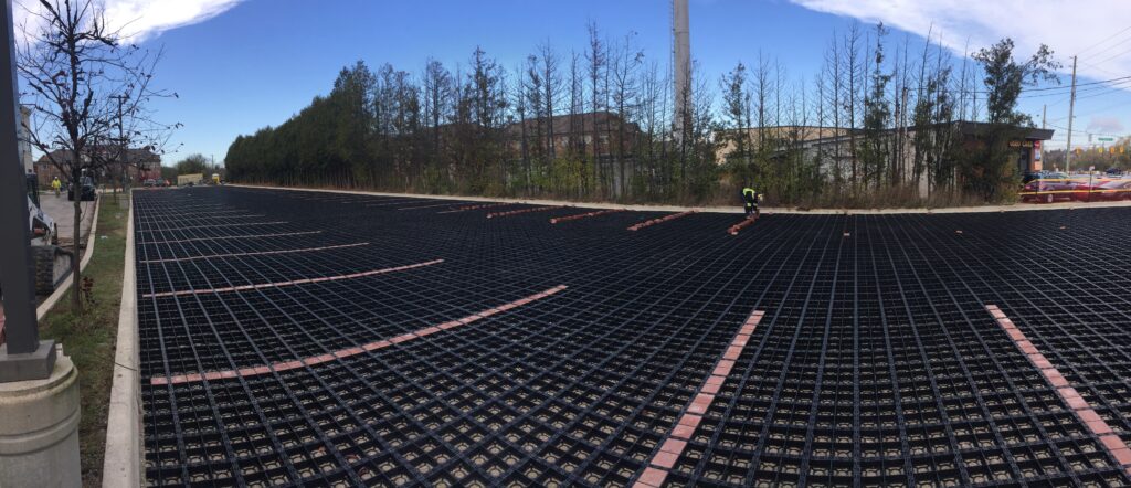 Faced with these challenges, the engineer consulted Terrafix Geosynthetics, Inc. to explore alternative solutions. After thoroughly reviewing the site conditions and requirements, the Ecoraster Bloxx, a surface reinforcement system that promotes stormwater infiltration, was recommended. Reducing the total volume of stormwater runoff can mitigate localized flooding and reduce the potential for erosion in the catchment area.