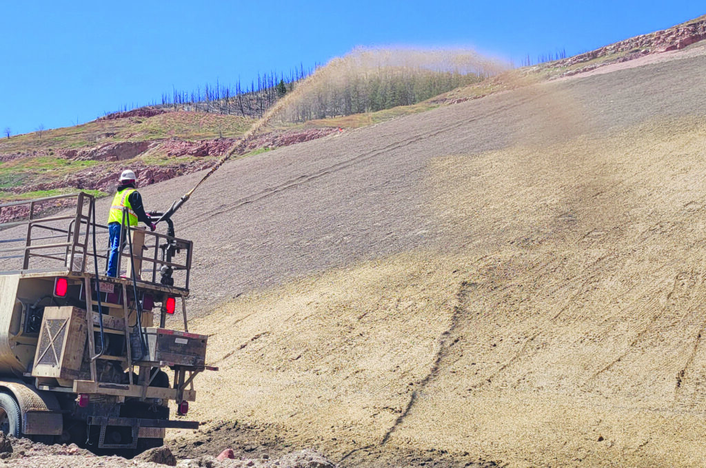 Initial specifications called for applying topsoil, but that can bring inconsistent quality, higher costs, and greater labor risks, especially on steep terrain. Workers instead developed a new custom erosion control and revegetation plan that included applying biotic soil technologies—engineered organic growth media designed to revitalize the denuded soil—and a combination of hydraulically applied erosion control products and erosion control blankets to hold seed and soil in place.