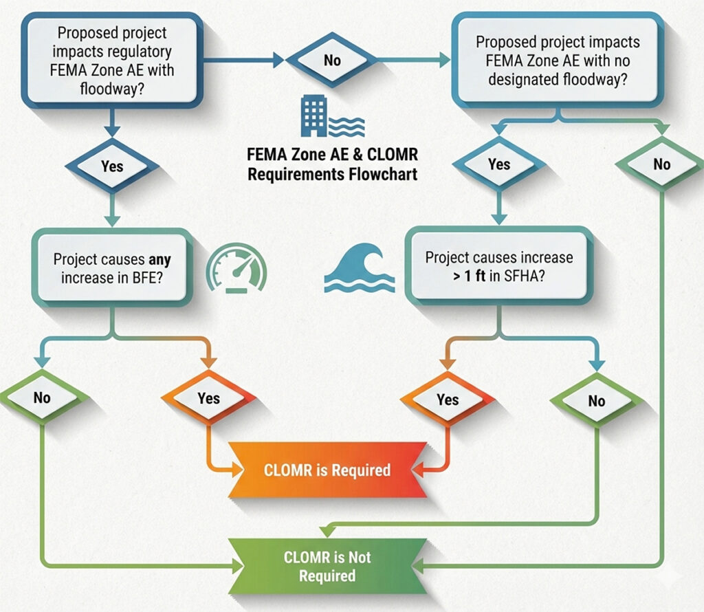 CLOMRs are required by FEMA in certain instances (Fig. 4), but are otherwise considered optional and up to the local floodplain administrator. They may take up to a year to coordinate through FEMA before issuing local permits, and after construction, the LOMR process with FEMA can add another 12–15 months before the flood map is officially updated. Factor this into your project strategy from the outset.